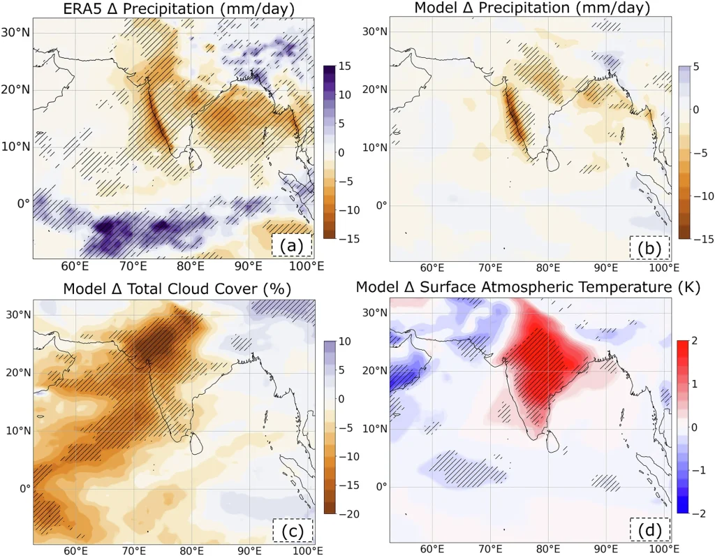 In August 2023, India experienced its driest August since records began, with a 36% rainfall deficit. A new study by Roșu et al. suggests that the unprecedented Canadian wildfires* of the same year may have contributed to this anomaly. The smoke from these fires cooled the atmosphere over Eurasia, weakening monsoon winds and reducing moisture transport to India, which led to significantly less rainfall.